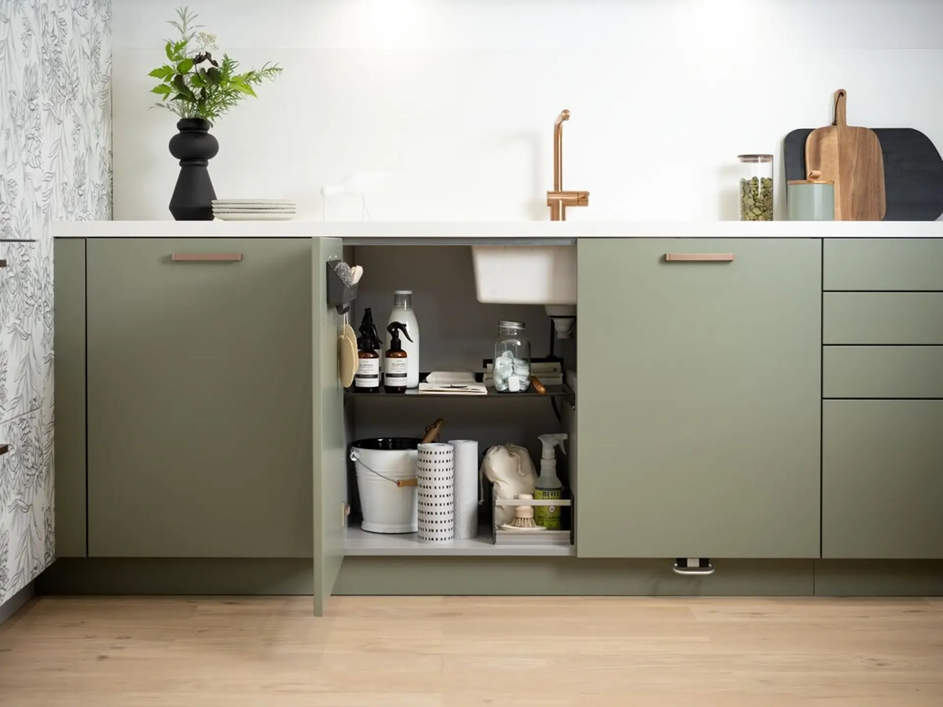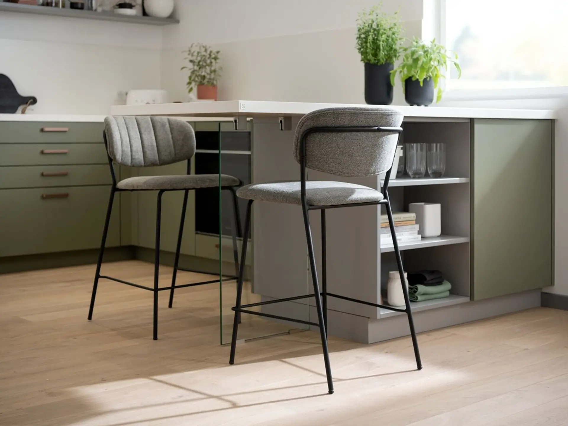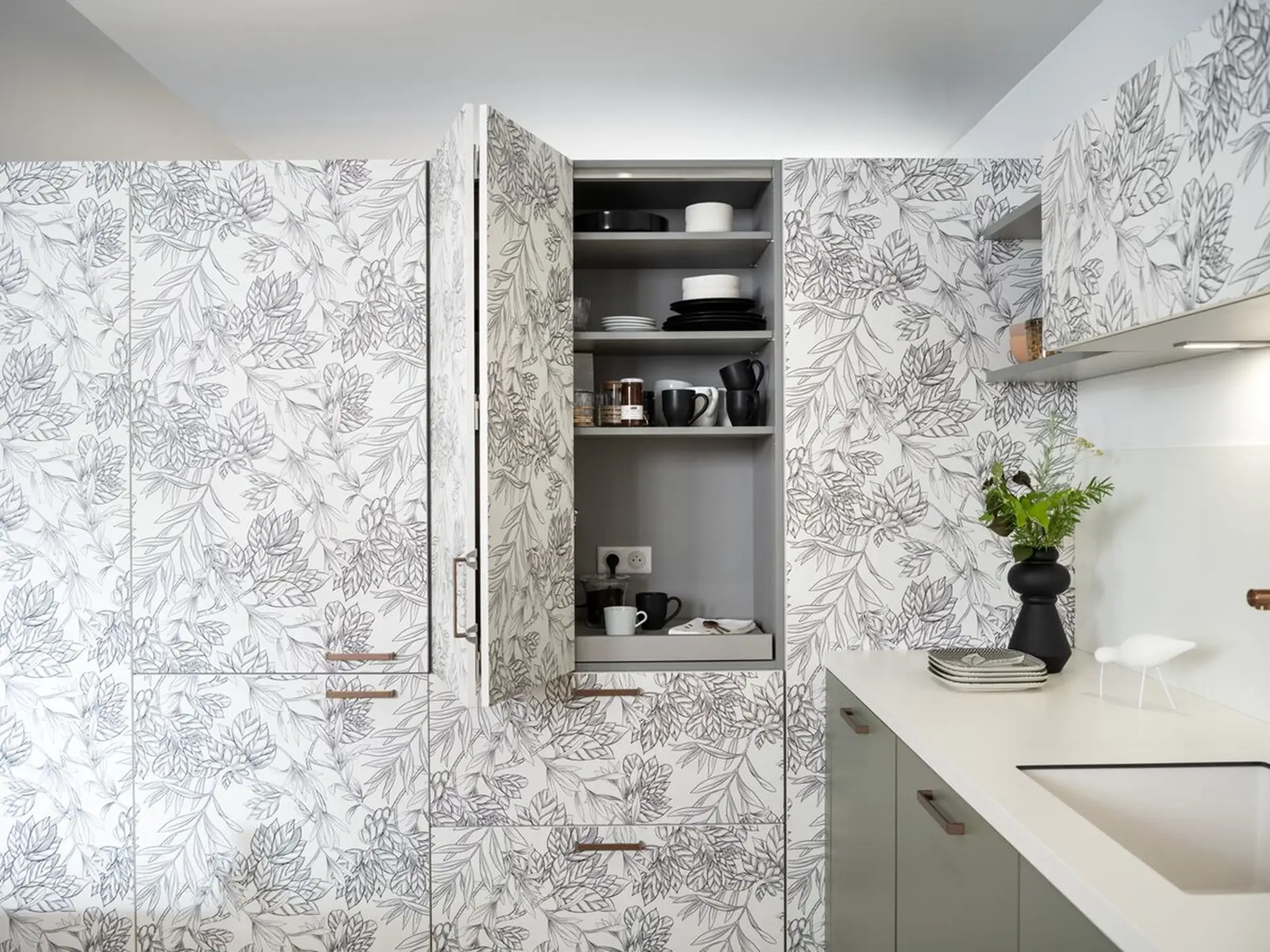 Esta cocina en U está perfectamente adaptada a la forma de la estancia. El estampado Botanic Black asociado al color verde Mossa y al tono gris Stone Grey crea un ambiente acogedor y agradable.