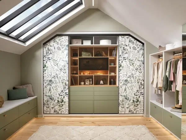 Vestidor bajo techo inclinado con puertas correderas, de color verde Mossa y decorado con estampado impreso Watercolor Green. Este vestidor cuenta con una distribución ideal, ya que ofrece numerosas posibilidades de incorporar accesorios.