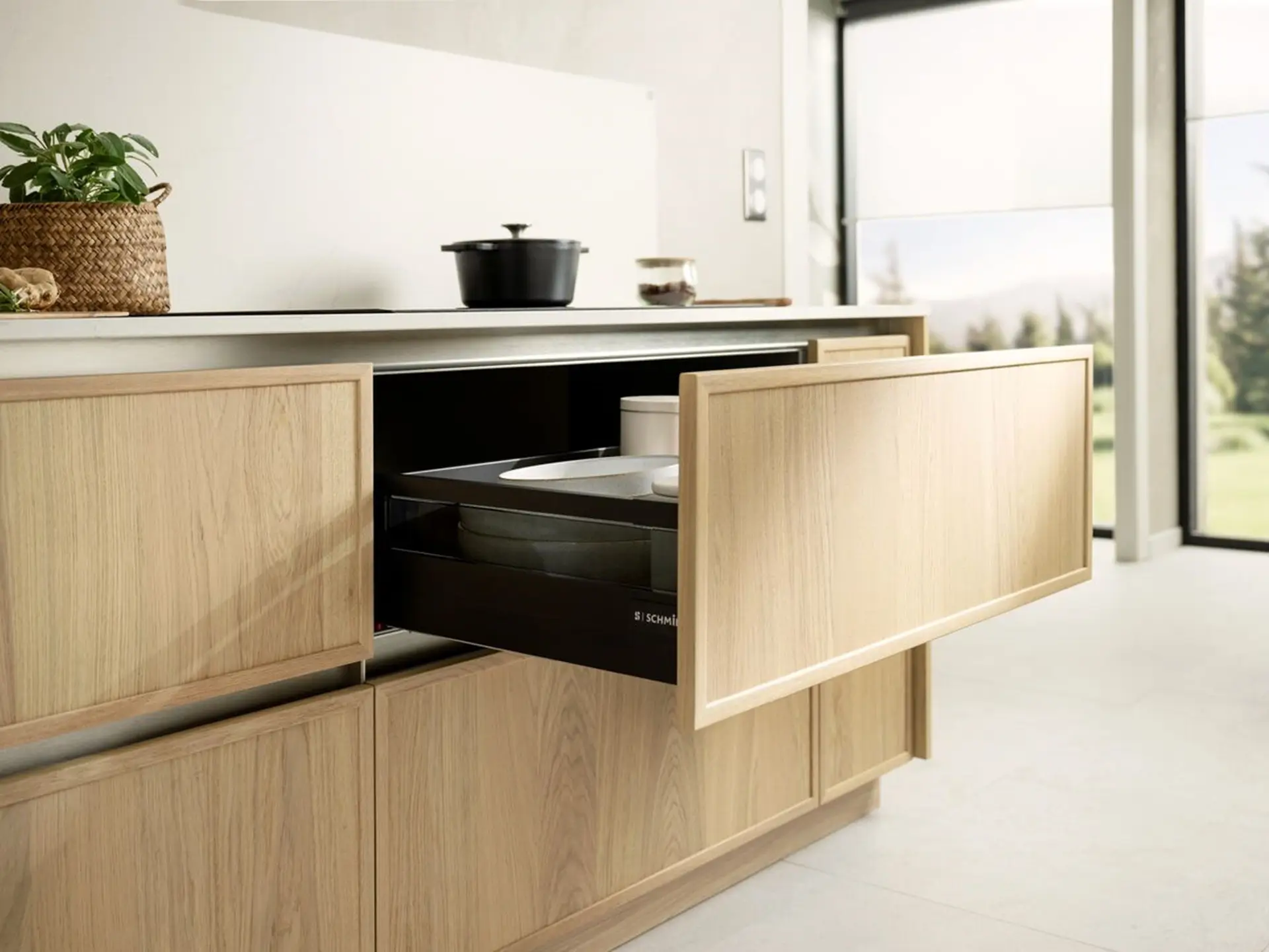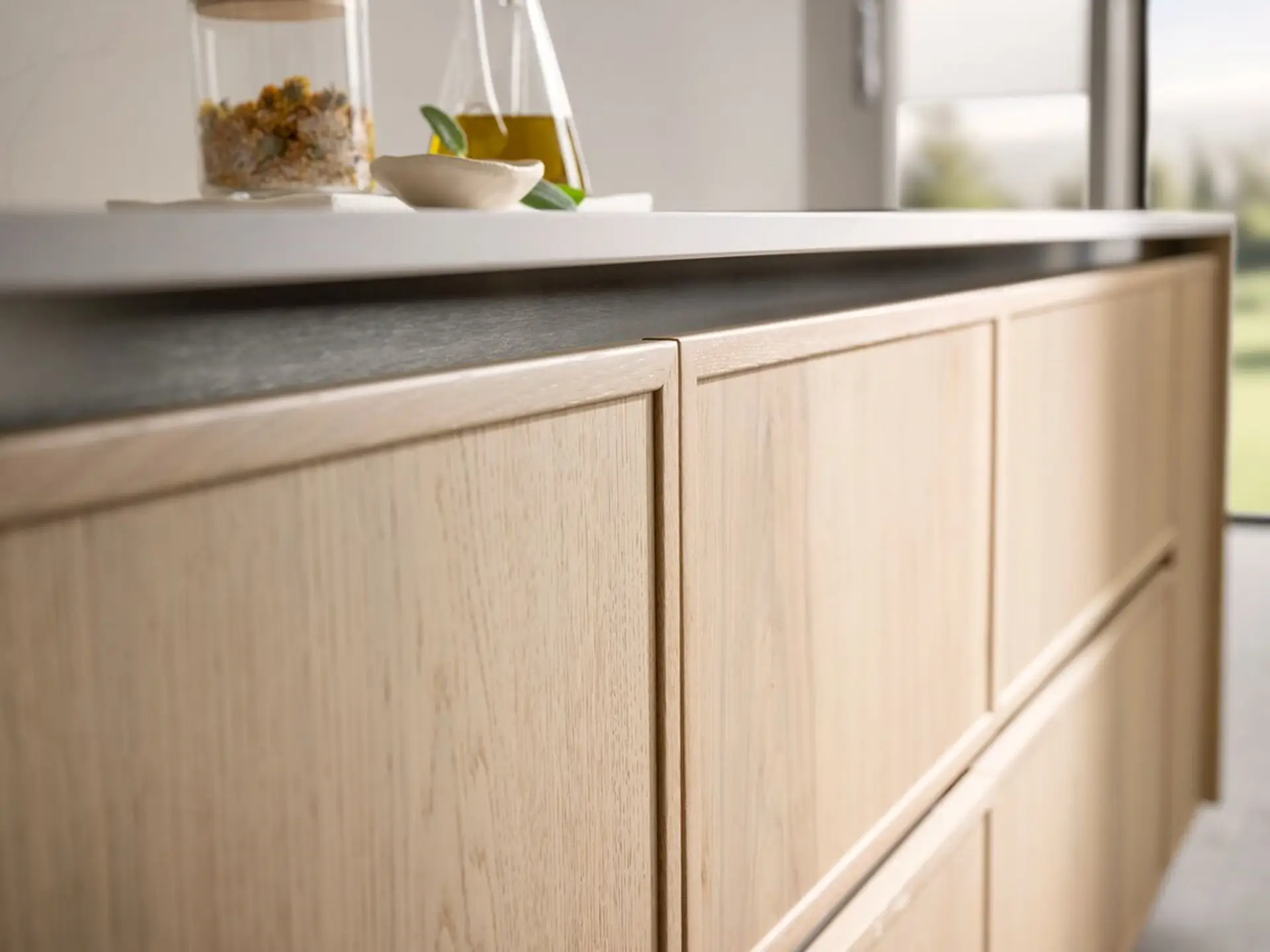 ¡La cocina OSLO, con su combinación de madera y color Avocado, constituye un pedacito de naturaleza dentro de tu hogar! La madera es un elemento cálido y agradable al tacto que nunca pasa de moda, lo que la convierte en EL material ideal por excelencia para crear una cocina acogedora. El color Alona Oak que te ofrece Schmidt es un tono que conjuga delicadeza y sofisticación. Las frentes sin tiradores y los marcos en relieve aportan ese toque original que no desentona en absoluto con la suavidad de líneas de los frentes. La encimera White Teti de cuarzo reciclado y los frentes de los muebles altos de color Avocado están pensados para rematar con elegancia el conjunto.