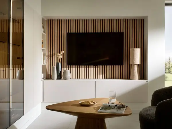 Mueble de TV de estilo escandinavo (de colores Clay y Alona Oak) que consta de múltiples y prácticas soluciones de almacenaje: estantes, armarios y puertas batientes, así como muebles vitrina con cristales tintados de color Parsol Grey.